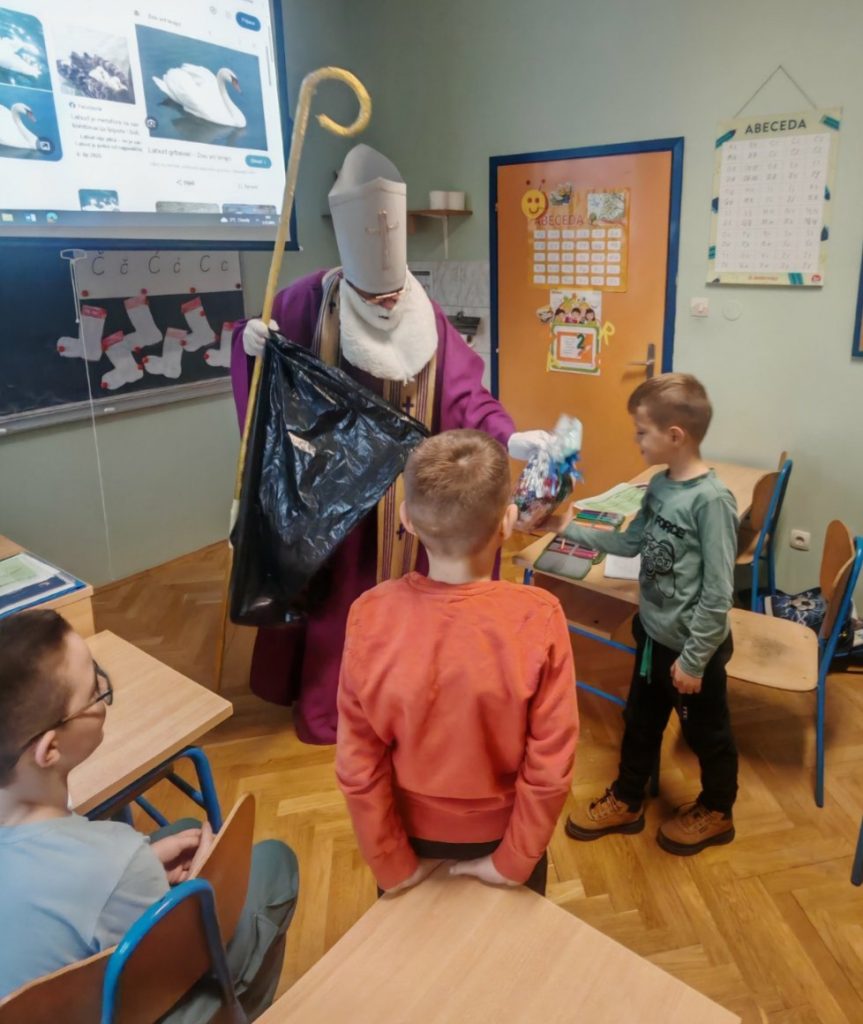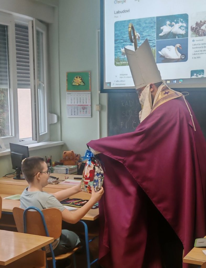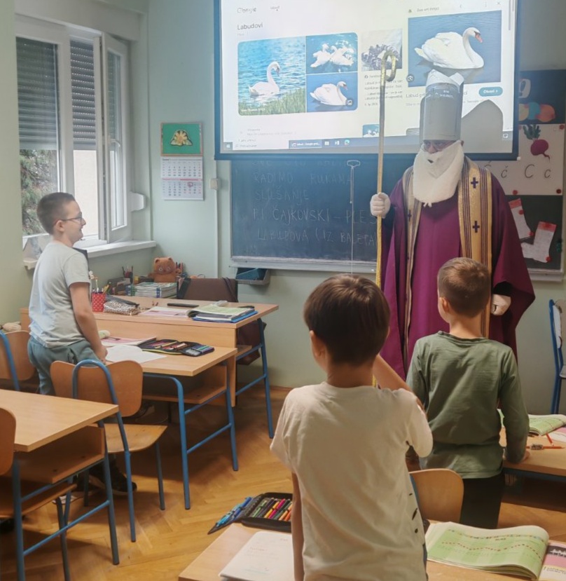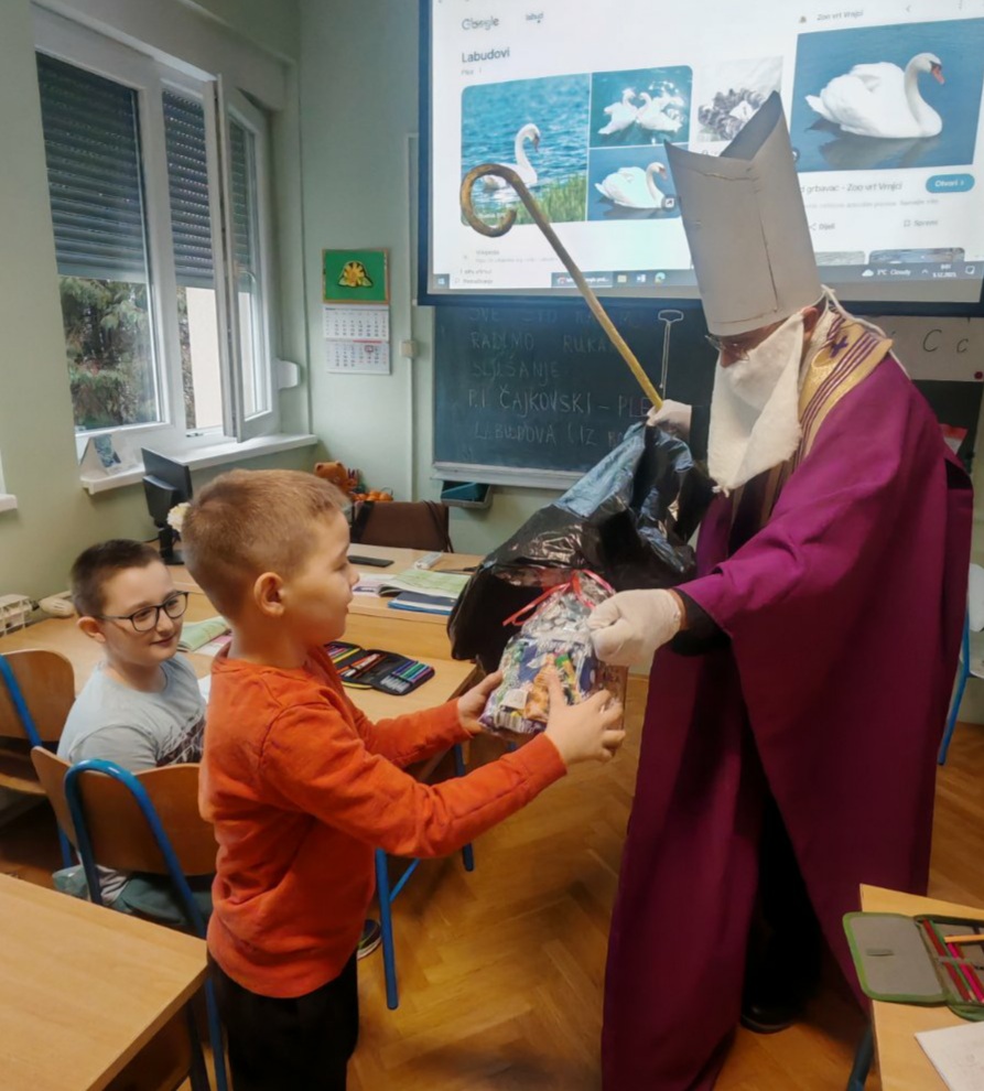 I onda, gle čuda! 5. prosinca, u prijepodnevnim satima, na vrata naše škole pokucao je ovaj svetac, zaštitnik djece i pomoraca. Nije pitao tko li je dobar jer zna da su sva djeca dobra (neka manje, neka više). Mnogima je izmamio osmijehe. Podijelio je učenicima slatke poklone. Poneke je ostavio s izrazom čuđenja na licu. Na kraju je sve toplo pozdravio i … nestao.